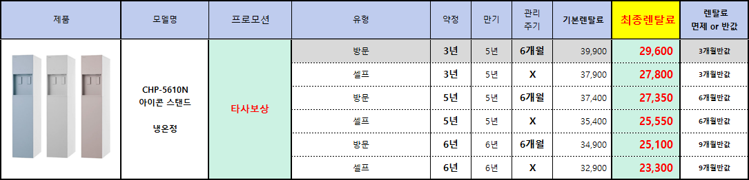 각 렌탈사의 월 렌탈료,제휴카드혜택,A/S기간,약정기간,혜택 등 비교하고 선택해 보세요.